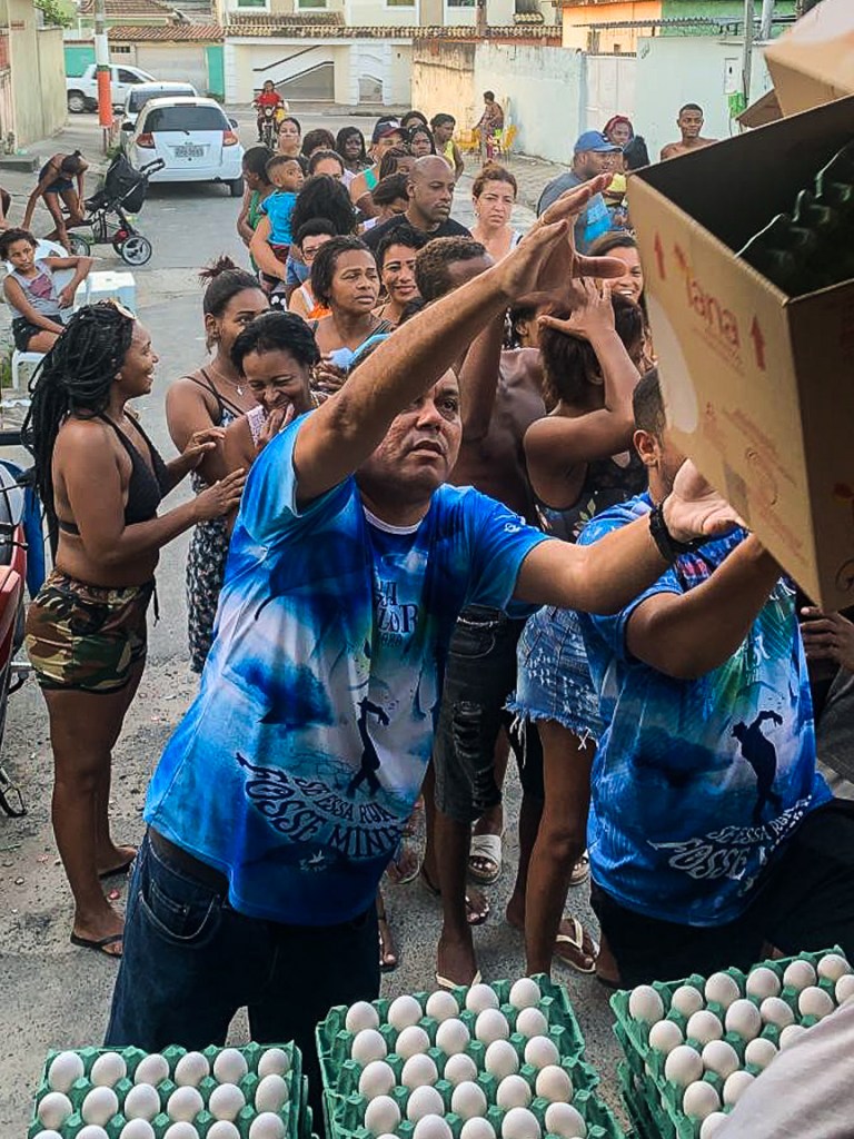 Entrega de donativos (incluindo alimentos não perecíveis, roupas e colhões) na quadra