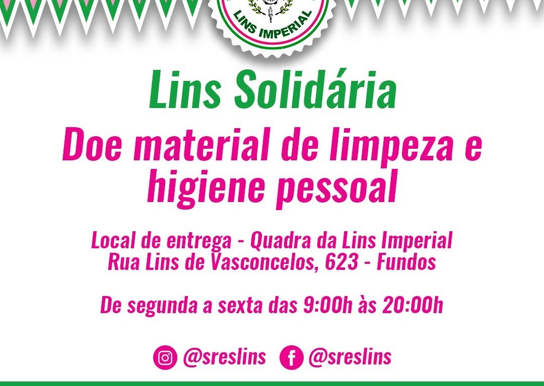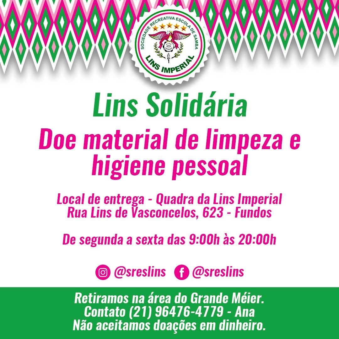 A campanha “Lins Solidária” iniciou na última quarta-feira, 1° de abril, e já arrecadou mais de 300 cestas básicas e materiais de higiene. Quem estiver interessado em colaborar, a verde e rosa recebe donativos de segunda a sexta de 9 às 20 horas na quadra da agremiação situada na rua Lins de Vasconcelos 623 (portão dos fundos – Rua Ernestina). Quem preferir, poderá entrar em contato com a diretora Ana Lucia através do telefone 21 96476-4779 e agendar um local para que a equipe da escola faça a retirada.