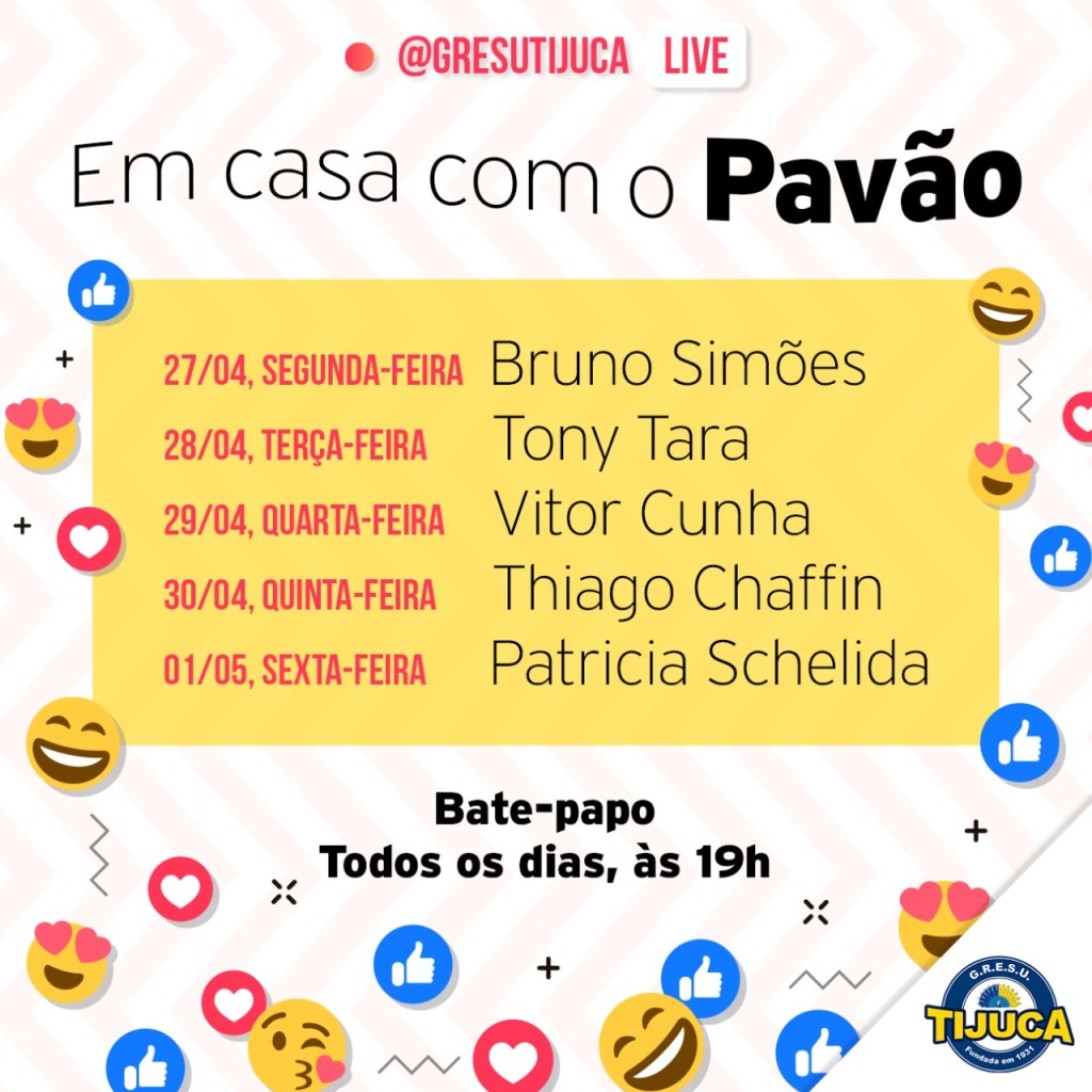 A Unidos da Tijuca que iniciou na última semana lives pela internet com os profissionais contratados e renovados para o Carnaval 2021 da agremiação, preparou nova programação devido ao sucesso alcançado. O #EmCasaComOPavão será um bate-papo com personalidades da escola e os internautas. O encontro acontecerá de segunda a sexta sempre às 19 horas no instagram da escola, @gresutijuca.