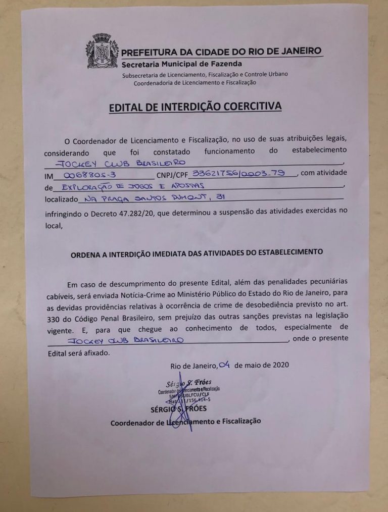 A Prefeitura do Rio, por meio da Secretaria Municipal de Fazenda, afixou nesta segunda-feira (4/5) no Jockey Club Brasileiro, na Lagoa, Zona Sul, um edital de interdição coercitiva. O documento é administrativo e obriga a interdição imediata das atividades do local.
