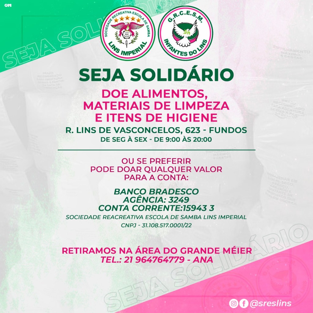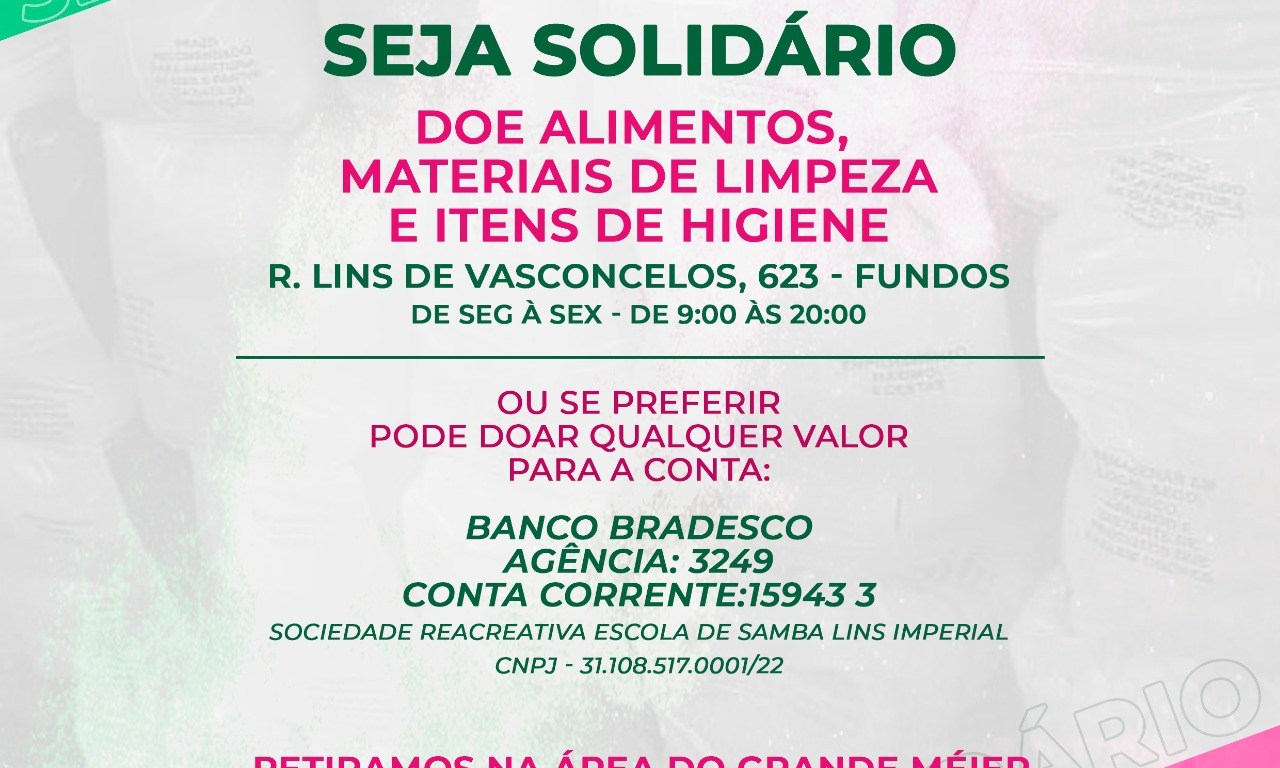 Para continuar com o projeto, as escolas recebe diariamente de 9 às 20 horas alimentos não perecíveis, frutas, legumes, carnes, hortaliças, descartáveis, materiais de higiene e limpeza. Para quem preferir fazer a doação em dinheiro a conta para depósito é Banco Bradesco, Agência 3249, Conta Corrente 15943-3 – Sociedade Recreativa Escola de Samba Lins Imperial – CNJP 31.108.517.001/22. Quem preferir que a agremiação retire a doação no local poderá entrar em contato com o whatsaap 21 96476-4779.