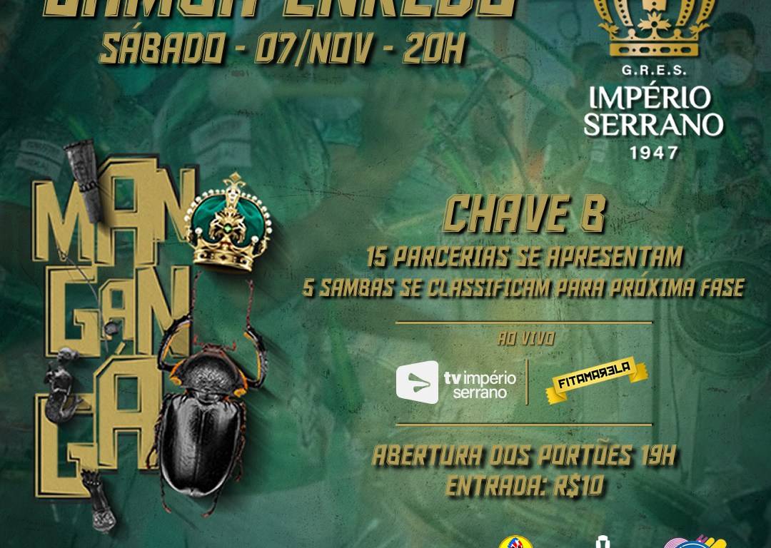 A 2ª eliminatória de samba-enredo do Império Serrano será aberta ao público, com abertura dos portões às 19h e entrada no valor de 10 reais, mas também transmitida ao vivo pela TV Império Serrano e Canal FitAmarela, iniciando às 20h. No próximo Carnaval, o Império Serrano vai levar para a Marquês de Sapucaí o enredo “Mangangá”, de autoria do Carnavalesco Leandro Vieira.