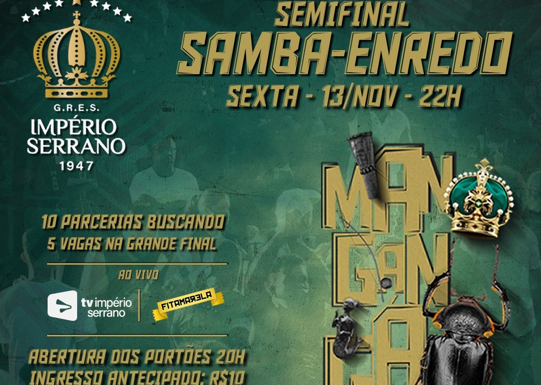 A Semifinal do Concurso de Samba-Enredo do Império Serrano acontece nesta sexta-feira, 13, com abertura dos portões às 20h e a disputa iniciando ao vivo pela TV Império Serrano e Canal FitAmarela a partir das 22h. O ingresso antecipado custa 10 reais. No próximo Carnaval, o Império Serrano vai levar para a Marquês de Sapucaí o enredo “Mangangá”, de autoria do Carnavalesco Leandro Vieira.