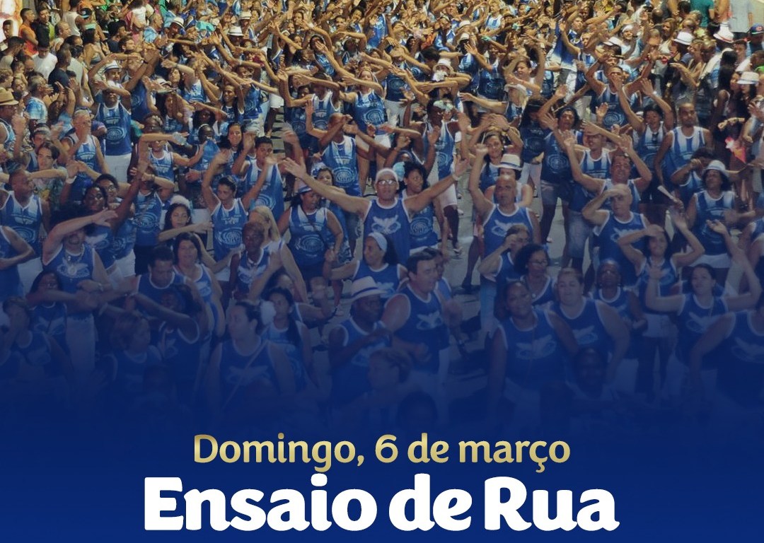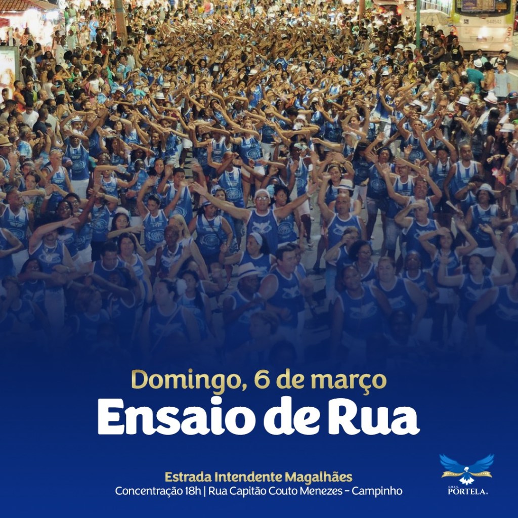 O G.R.E.S Portela retornará com seus ensaios de rua neste domingo, dia 06 de março, na Estrada Intendente Magalhães.