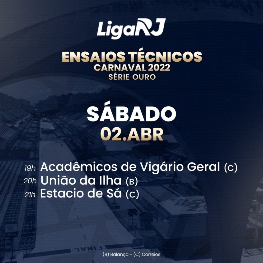 O mês de abril chegou e estamos cada vez mais próximos dos desfiles de 2022! Nesse fim de semana vamos dar continuidade a mais uma série de ensaios técnicos na Sapucaí. Neste sábado, 02, vão passar pelo Sambódromo: Acadêmicos de Vigário Geral, União da Ilha e Estácio de Sá, respectivamente.A entrada é gratuita, mas o local está sujeito a lotação. Após a passagem da última agremiação, o Grupo Deita e fará uma roda de samba na Praça do Samba, atrás do Setor 2.