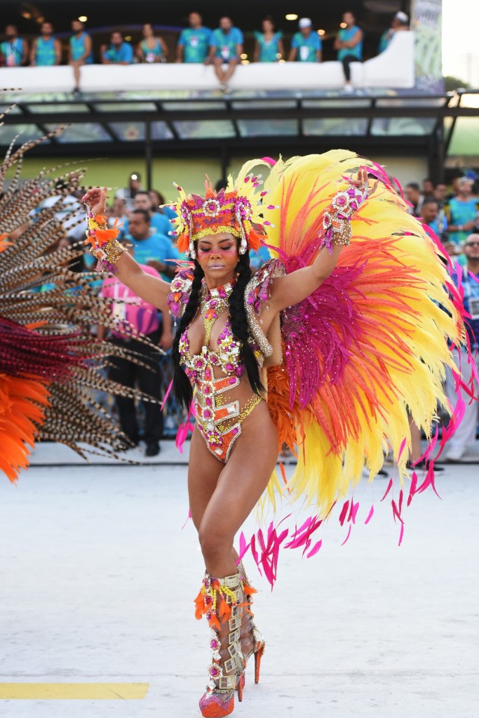 O dia já estava totalmente claro quando o Acadêmicos do Sossego entrou na Marquês de Sapucaí. Com atrasos, a escola que entraria na madrugada, iniciou seu desfile depois das seis da manhã, e nem isso abalou a Rainha de bateria da escola Malu Torres. Representando a Energia Africana, a majestade apostou em cores fortes no seu figurino.
