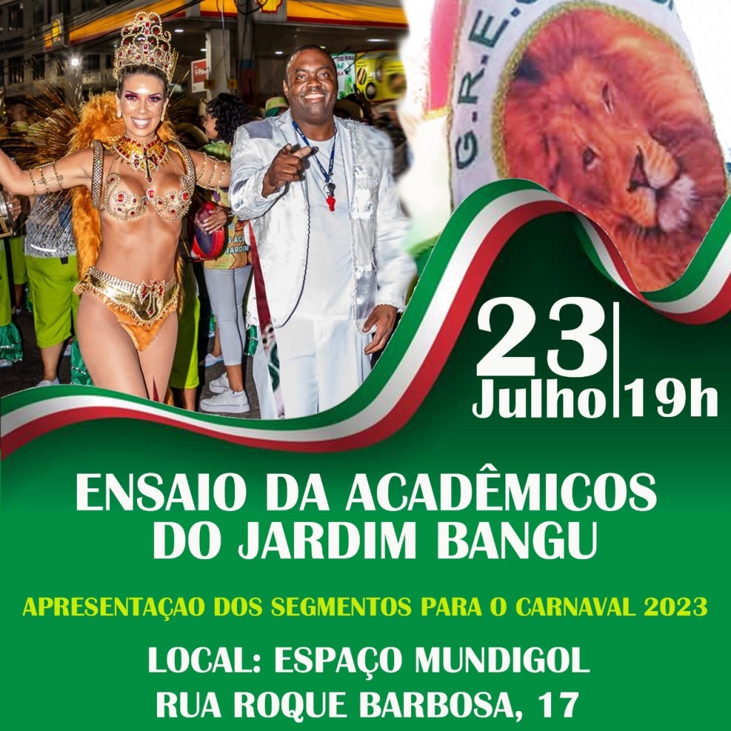 No sábado dia 23 de julho o Acadêmicos do Jardim Bangu dará o ponta pé inicial para os trabalhos voltados para o carnaval 2023. A agremiação fará o primeiro ensaio para o próximo desfile, além de apresentar a equipe que defenderá seu pavilhão.