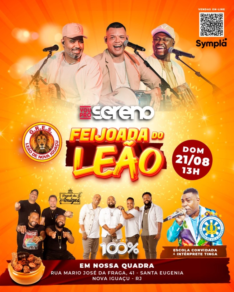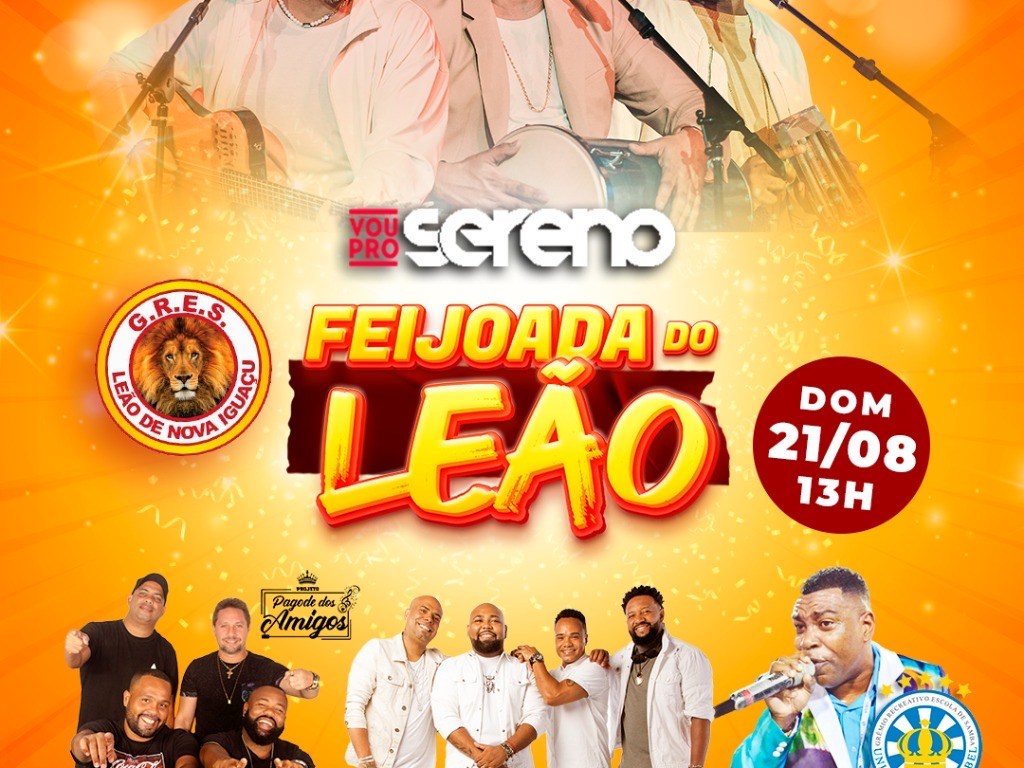 Nova Iguaçu irá parar no próximo domingo, dia 21 de agosto. Vou Pro Sereno, Grupo 100%, Pagode dos Amigos e a Unidos de Vila Isabel serão as atrações da “Feijoada do Leão”, que será realizada na quadra do Leão de Nova Iguaçu. A agremiação abre as portas da sua sede para uma tarde de muito samba.