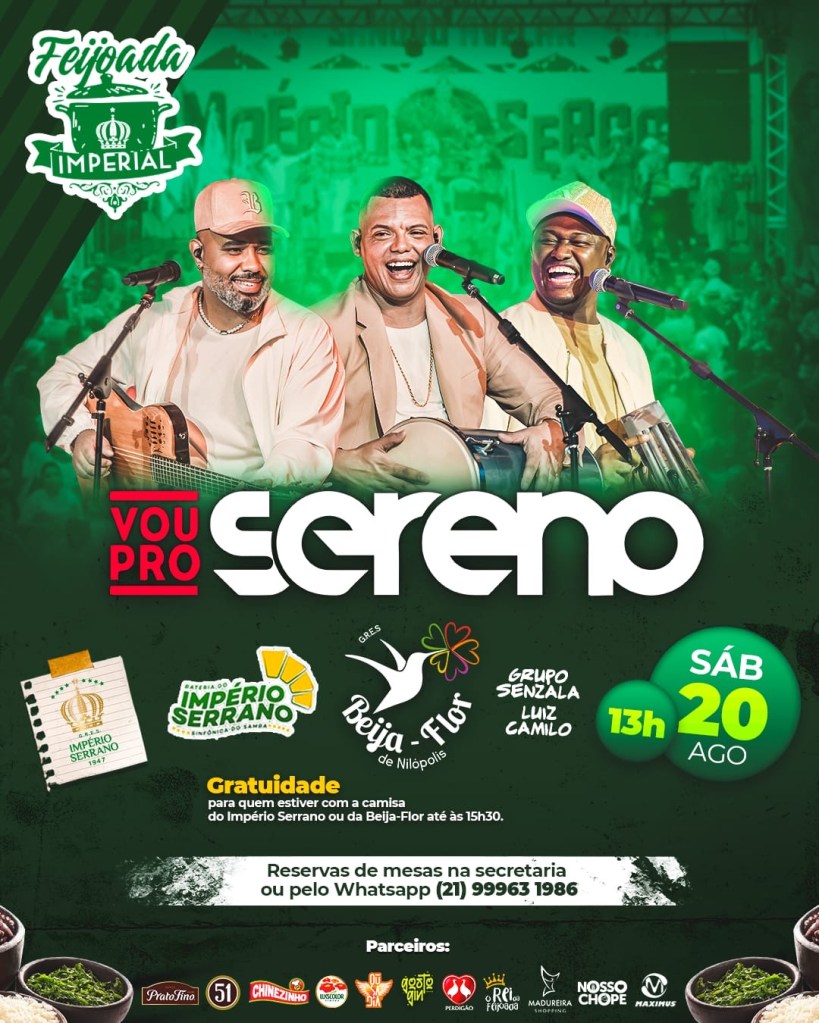 O Império Serrano abre as suas portas, no próximo sábado, 20, a partir das 13h, para a edição de agosto da Feijoada Imperial. Neste mês, o evento vai contar com os shows do Vou Pro Sereno, da Beija-Flor de Nilópolis e, claro, do elenco show do Reizinho de Madureira, com o Grupo Senzala e o cantor Luiz Camilo abrindo a festa.