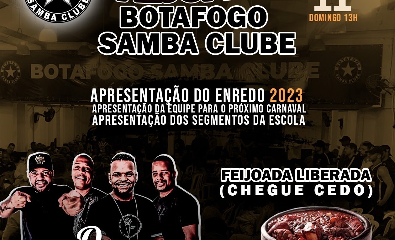 No próximo domingo, 11, a Botafogo Samba Clube realiza feijoada para apresentar a sua equipe e o enredo para o Carnaval 2023. O evento será na quadra da escola, no bairro do Engenho de Dentro, Zona Norte do Rio, a partir das 13h, com roda de samba com o Grupo QA+ e show dos segmentos alvinegros.
