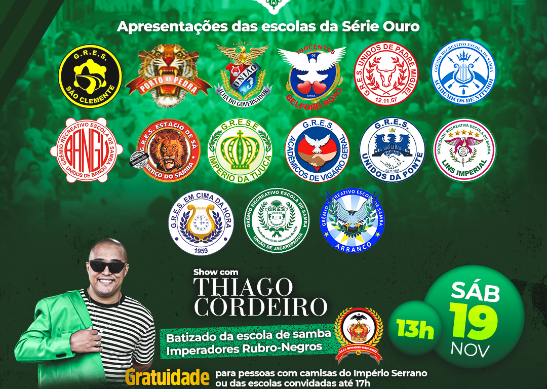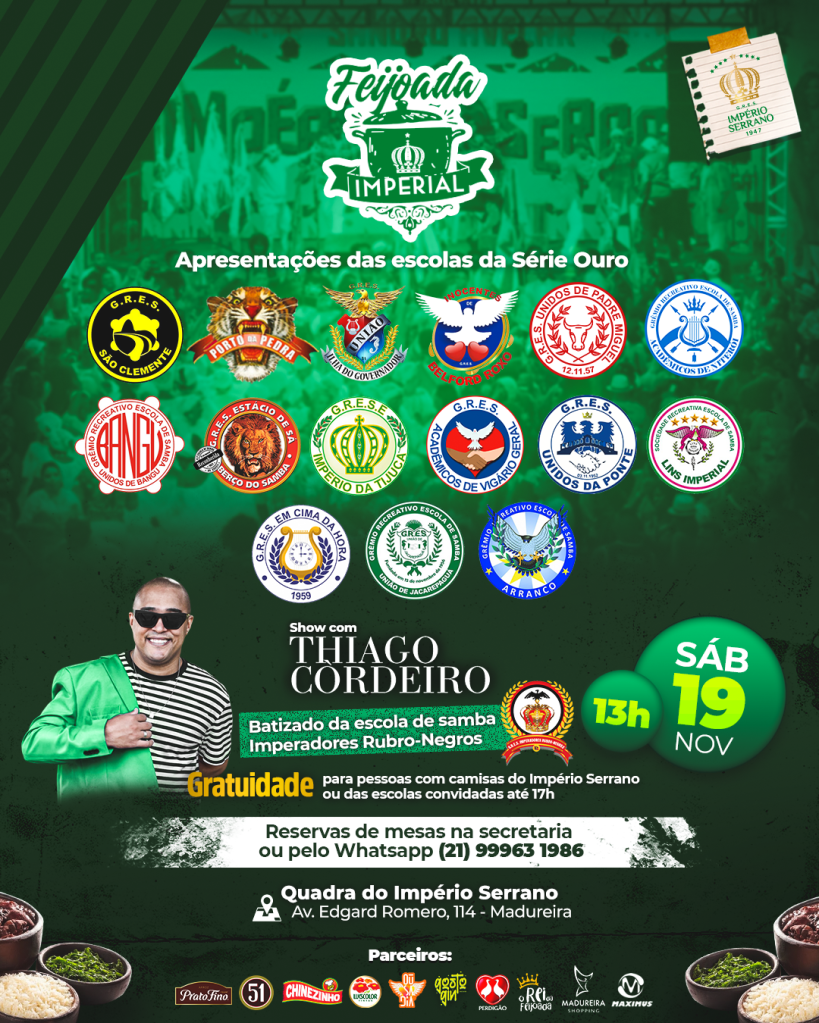 No próximo sábado, 19, a partir das 13h, o Império Serrano realiza a edição de novembro da Feijoada Imperial. Neste mês, o Reizinho de Madureira vai receber as 15 escolas que compõem a Série Ouro, que vão apresentar os seus sambas para o Carnaval 2023, além do show do cantor Thiago Còrdeiro e o batizado da Imperadores Rubro-Negros, agremiação da Série Prata.