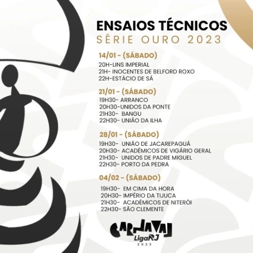 A partir deste sábado, 14 de janeiro, começam os ensaios técnicos das escolas da Série Ouro, na Marquês de Sapucaí. Os treinos estão marcados para começar sempre às 20h. A estreia começa com Lins Imperial, Inocentes de Belford Roxo e Estácio de Sá.