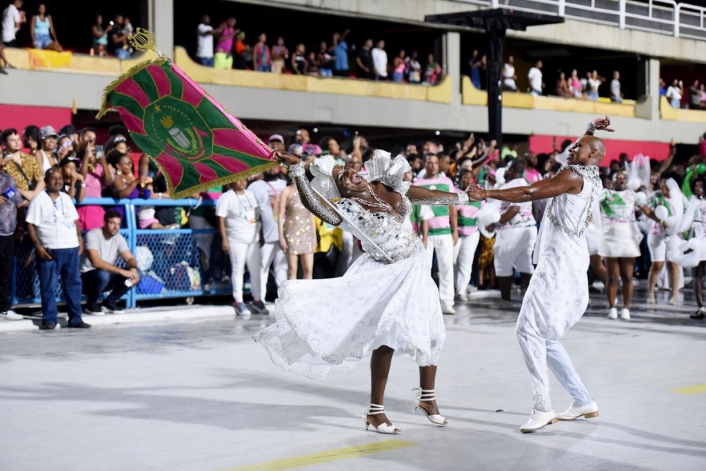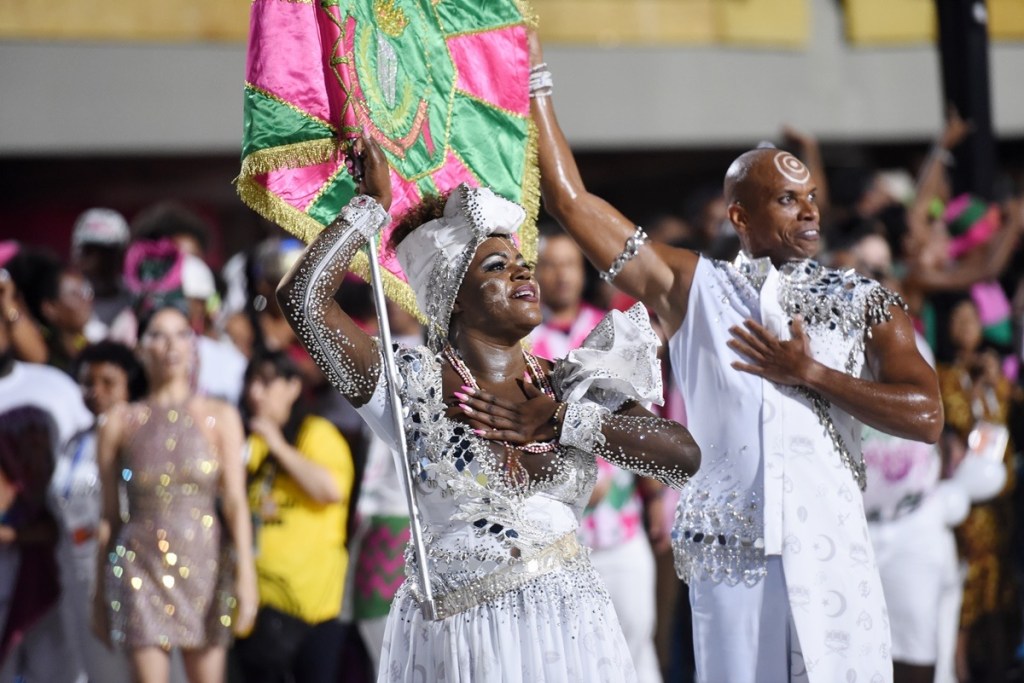 A noite de ensaio também foi de estreia para a porta-bandeira Cyntia Santos, que encarou pela primeira vez o desafio de cruzar o Sambódromo lotado conduzindo o pavilhão da agremiação. Ela migrou da Porto da Pedra para a Mangueira e tem a companhia do mestre-sala Matheus Olivério — os dois foram ovacionados na pista.