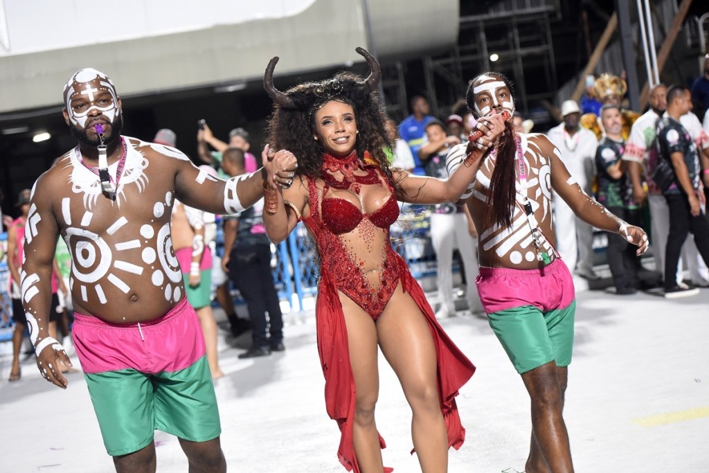 Além do casal, a rainha de bateria Evelyn Bastos também causou impacto: estava fantasiada em referência à orixá Oyá, em sua versão que se transforma em búfalo. O figurino arrancou aplausos das frisas e arquibancadas.