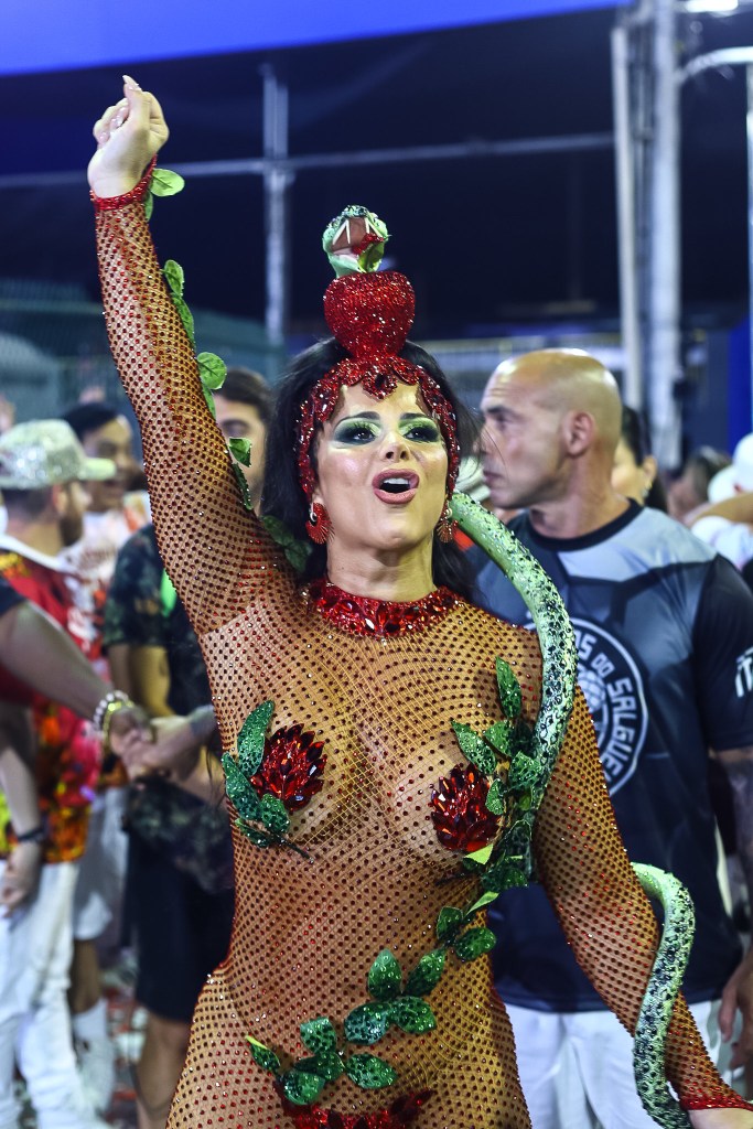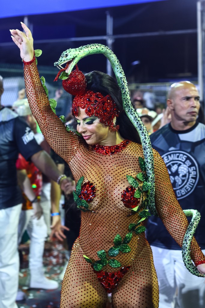 O primeiro impacto salgueirense no Sambódromo seguiu à risca a tradição da vermelha e branca: foi a bateria “Furiosa”, comandada pelos mestres Guilherme e Gustavo e estrelada pela atriz Viviane Araújo, rainha pelo 16º ano consecutivo. Comumente chamada pelo público de “rainha das rainhas”, Vivi apareceu diante do Setor 1 com um figurino inspirado no pecado cometido por Adão e Eva no Jardim do Éden — arrancou aplausos e gritos de aprovação enquanto caía no samba.