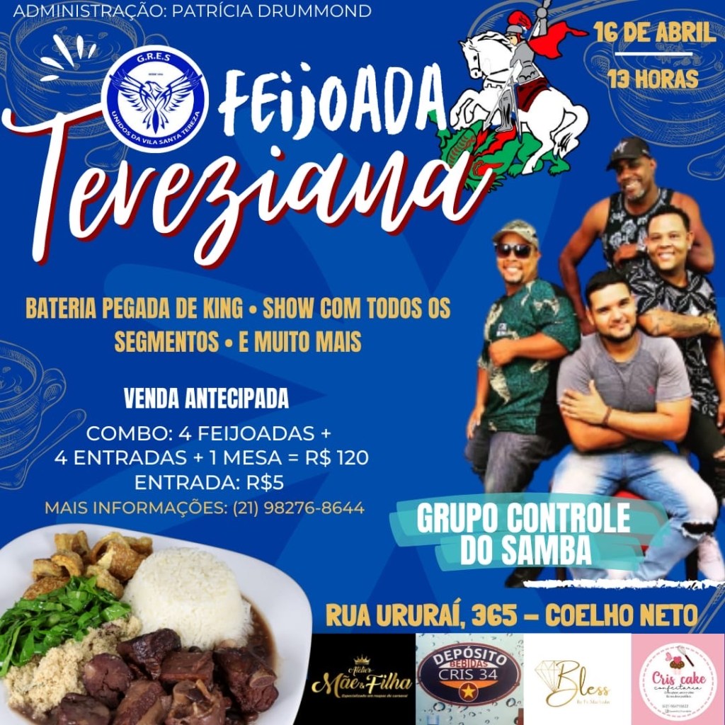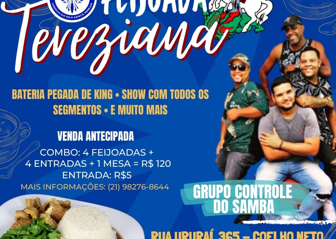 Dando ponta pé inicial visando o carnaval 2024, Unidos de Vila Santa Tereza promoverá sua tradicional feijoada de São Jorge, no próximo dia 16 de abril, às 13 horas, em sua quadra, rua Ururaí – 365 – Coelho Neto. A feijoada da agremiação contará com o show do grupo de pagode Controle do Samba, apresentação com todos os segmentos da escola e muito samba com a bateria Pegada de King. A mandatária Patrícia Drummond comenta sobre suas expectativas para a feijoada.