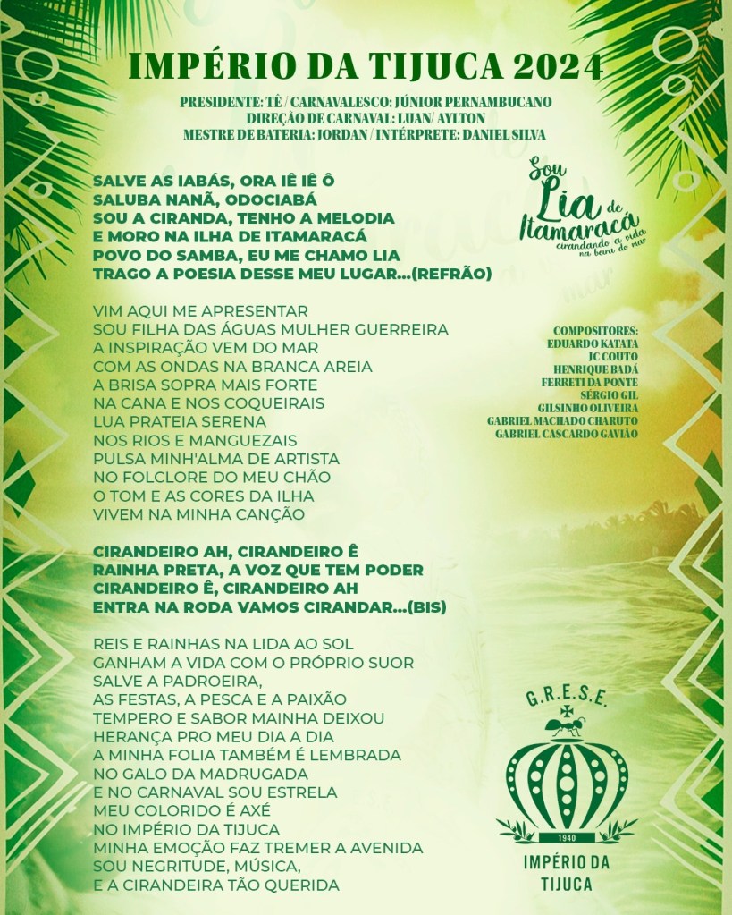 Após escolher o samba-enredo que levará para a Marquês de Sapucaí em 2024, a direção do Império da Tijuca realizou algumas modificações na letra do samba-enredo escolhido. Em 2024, a agremiação que será a segunda escola a pisar na Marquês de Sapucaí pela Série Ouro, homenageará a dançarina, compositora e cantora de ciranda brasileira, Lia de Itamaracá.