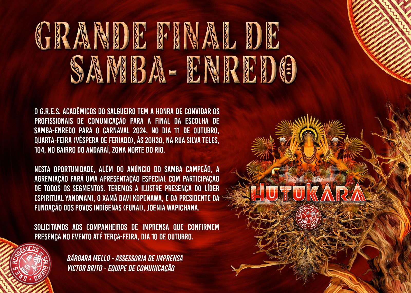 Os ensaios do Acadêmicos do Salgueiro acontecem aos sábados, a partir das 20h30, na quadra da Vermelho e Branco tijucana. Para a grande final, o elenco show da escola e a Bateria Furiosa prepararam uma apresentação especial, em homenagem aos Yanomami, os grandes protagonistas do enredo HUTUKARA.