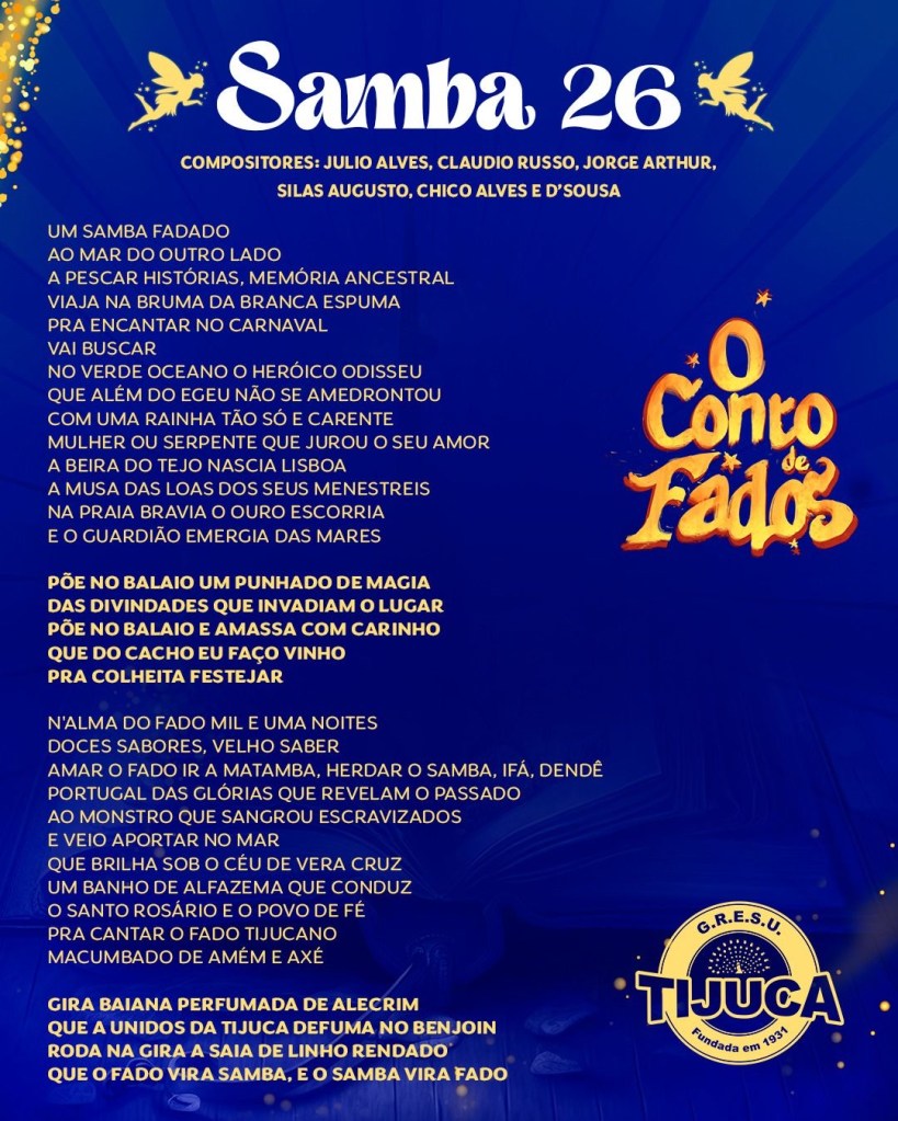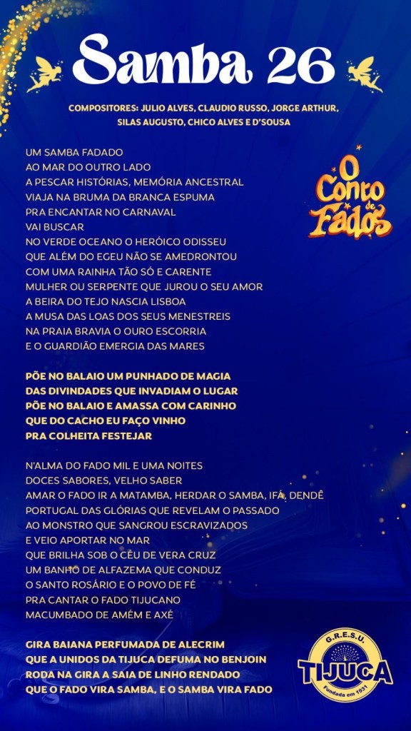 Encerrando a agenda das finais de samba-enredo do Grupo Especial, a Unidos da Tijuca escolheu na madrugada deste domingo o seu hino oficial para o Carnaval 2024. No concurso que começou com 11 sambas inscritos, venceu a parceria de Julio Alves, Claudio Russo, Jorge Arthur, Chico Alves e D’Sousa. O samba escolhido servirá de trilha sonora para o enredo “O Conto de Fados” que abordará a história de Portugal através das lendas e contos portugueses, do carnavalesco Alexandre Louzada.