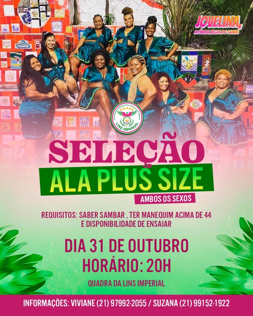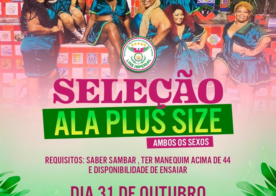 O termo em inglês “plus size” significa tamanho grande. É comum no mundo da moda para se referir às modelos que estão acima do peso. Na Lins Imperial, a ala que já virou um sucesso, é destaque nos shows da agremiação e na quadra e para 2024 abrirá novas vagas. Os interessados deverão possuir manequim acima de 46 e comparecer a quadra no dia 31 de outubro às 20 horas. Mais informações nos telefones (21) 97992-2055 ou 99152-1922.