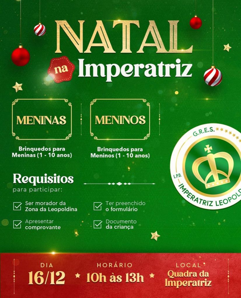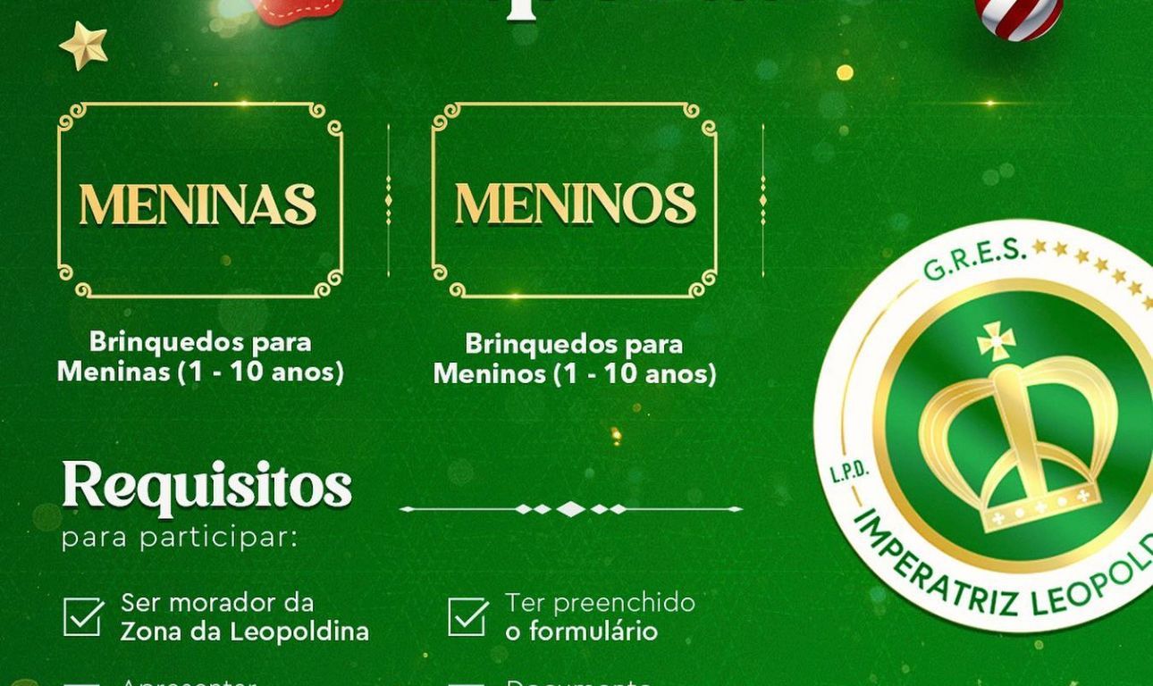 A Imperatriz Leopoldinense promove, neste sábado, mais uma ação do programa “Imperatriz Social”. A agremiaçãot fará distribuição de brinquedos para crianças de 1 a 10 anos. As inscrições foram feitas previamente e um dos pré-requisitos era ser morador da Zona da Leopoldina.