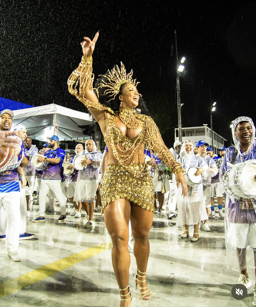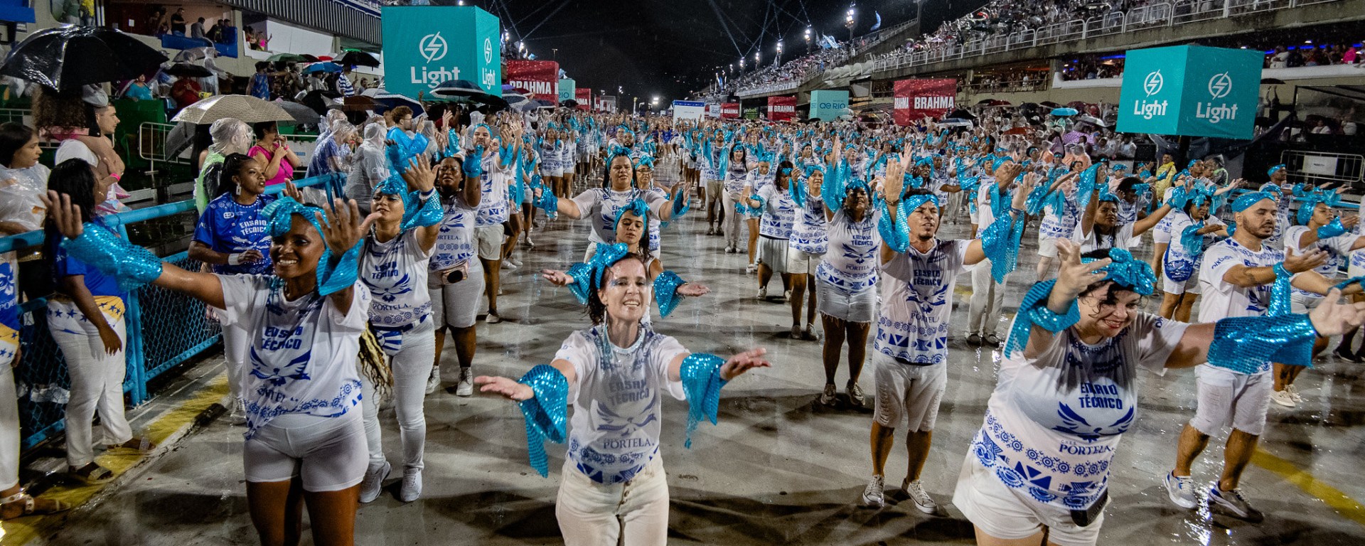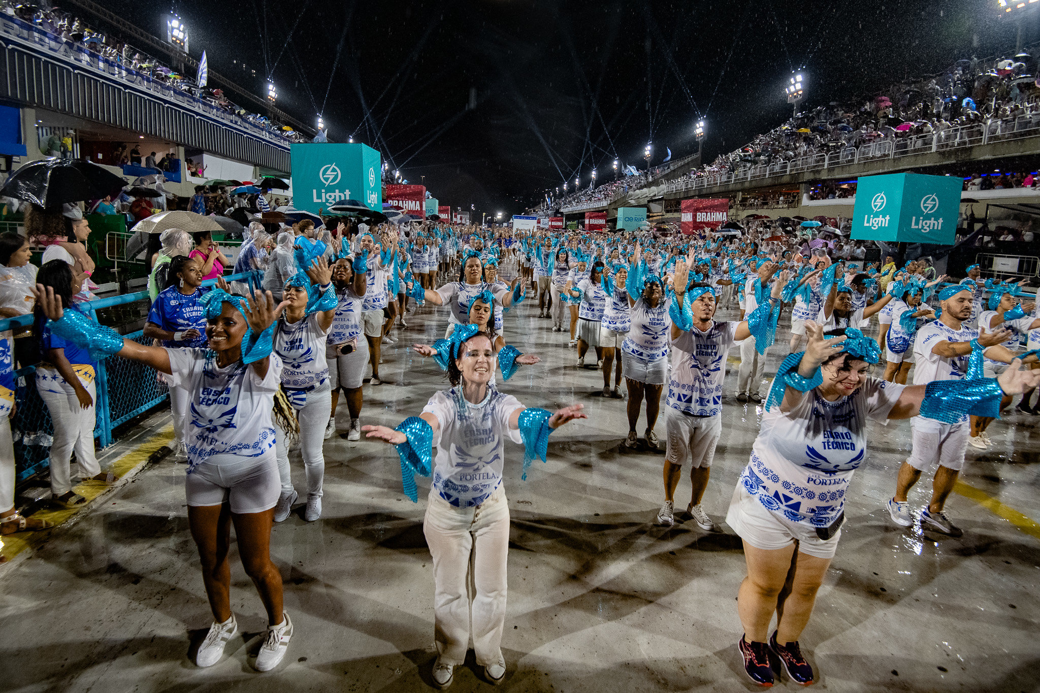 Mesmo com chuva contínua na cidade, a Portela chegou com o time praticamente completo, dando aos torcedores um gostinho do que vai ser o enredo “Um Defeito de Cor”, dos carnavalescos André Rodrigues e Antônio Gonzaga, baseado no romance da escritora Ana Maria Gonçalves.