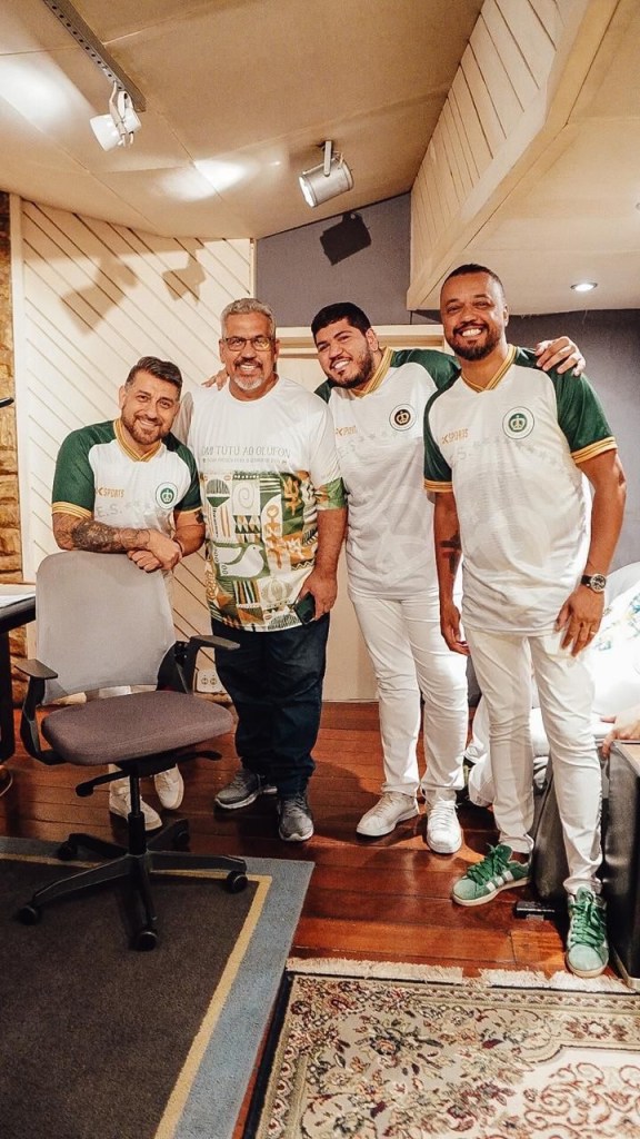 Participaram da gravação também os compositores, o casal de mestre-sala e porta-bandeira, Phelipe Lemos e Rafaela Theodoro, acompanhados da assistente de coreografia Carol Villanova, o diretor de marketing Gab Carvalho, além de outros departamentos da verde, branco e dourado.