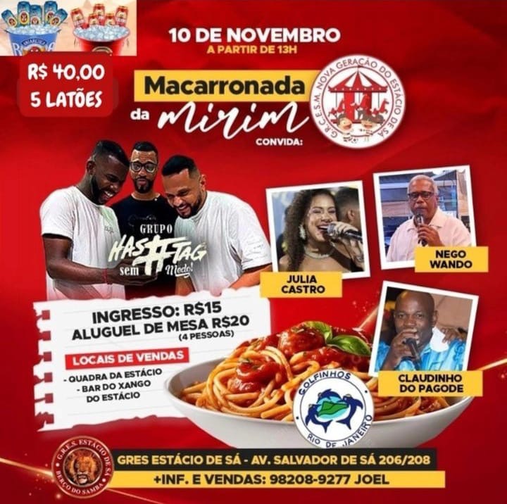No próximo domingo (10), a partir das 13 horas, a Nova Geração do Estácio promove a ‘Macarronada da Mirim’, na quadra da Estácio. Uma variedade de molhos, temperos e estilos musicais será servida, com apresentações do Grupo Hashtag sem medo, Julia Castro, Nego Wando e Claudinho do Pagode, além da escola convidada Golfinhos do Rio de Janeiro.