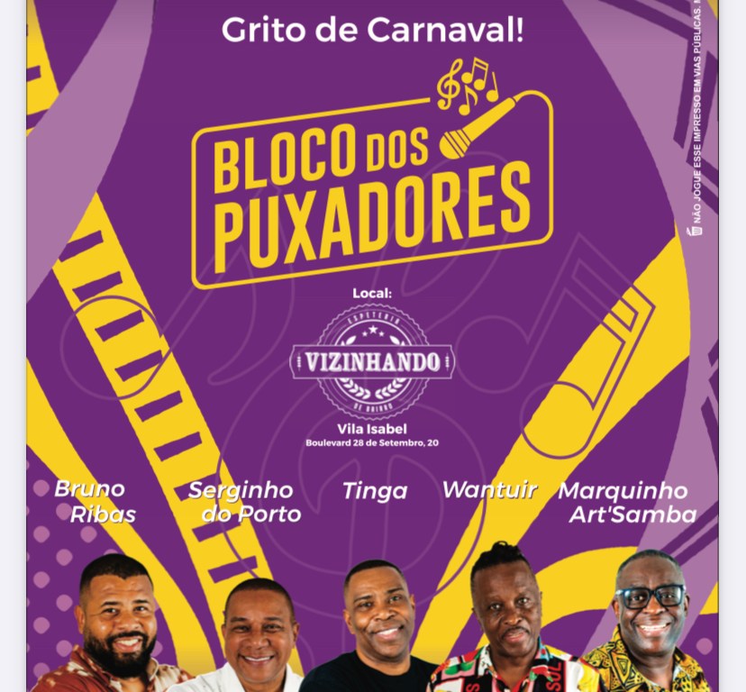Haverá ainda apresentação da Bateria da Unidos de Vila Isabel e do músico Chacal do Sax. Inspirado nas cores lilás e amarelo dos abadás do Bloco “Pagodão”, criado pela cantora Alcione e que brilhou na Marquês de Sapucaí, o Bloco dos Puxadores vai resgatar a essência do samba, homenagear grandes nomes do gênero, e exaltar a versatilidade e o talento dos intérpretes, classe muitas vezes desvalorizada no Carnaval.