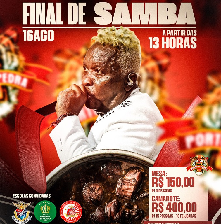 Muito mais do que uma final de samba, será um encontro de torcida, emoção e identidade. O público será o grande protagonista, vibrando com as obras que disputam o posto de hino oficial da Porto da Pedra para o próximo desfile na Marquês de Sapucaí. A tarde contará ainda com uma incrível apresentação da escola, mostrando toda a sua força artística e o envolvimento apaixonado da comunidade.