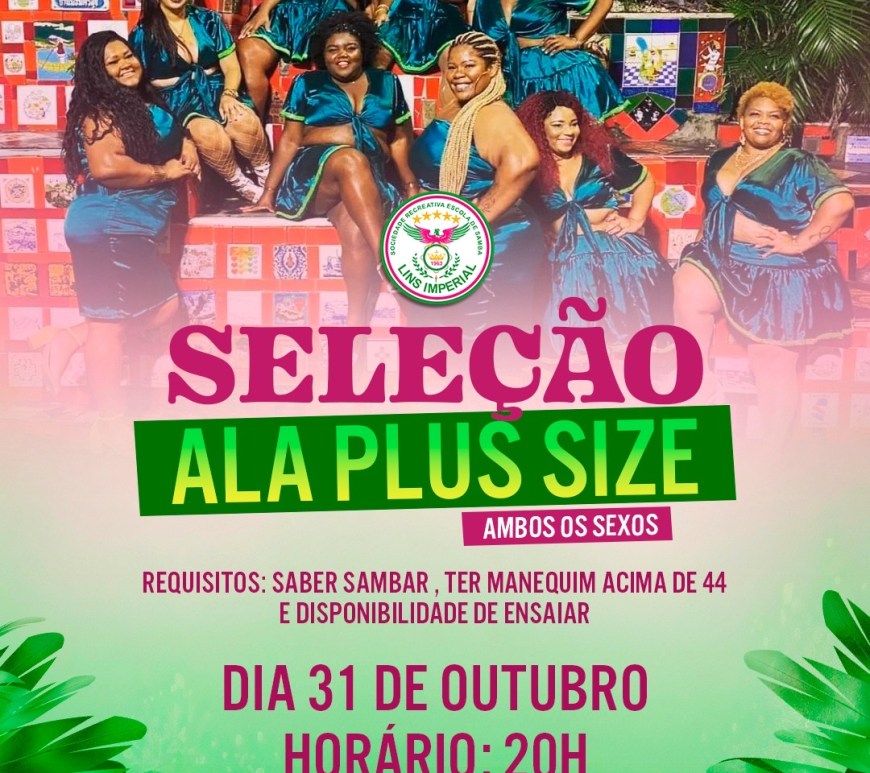 Ala Plus Size é sucesso na agremiação Homem e mulheres acima do manequim 46 terão mais um ano de destaque no desfile da Lins Imperial. Cerca de 50 sambistas plus size exibirão todo seu charme no carnaval da agremiação mostrando que o requebrado e o samba não são apenas para homens e mulheres de corpos esculturais. O termo em inglês “plus size” significa tamanho grande. É comum no mundo … Continuar lendo Lins Imperial abre vagas para ala destinada a homens e mulheres acima do manequim 46